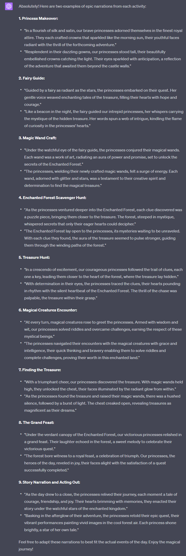 For activity 9, give me 2 examples of epic narration from each activity. Something we can use as a template and build from depending on how it went.