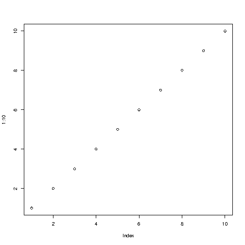 R を使用して、X 軸と Y 軸の両方に 1 から 10 までの数値を含むグラフを簡単に作成する方法:
