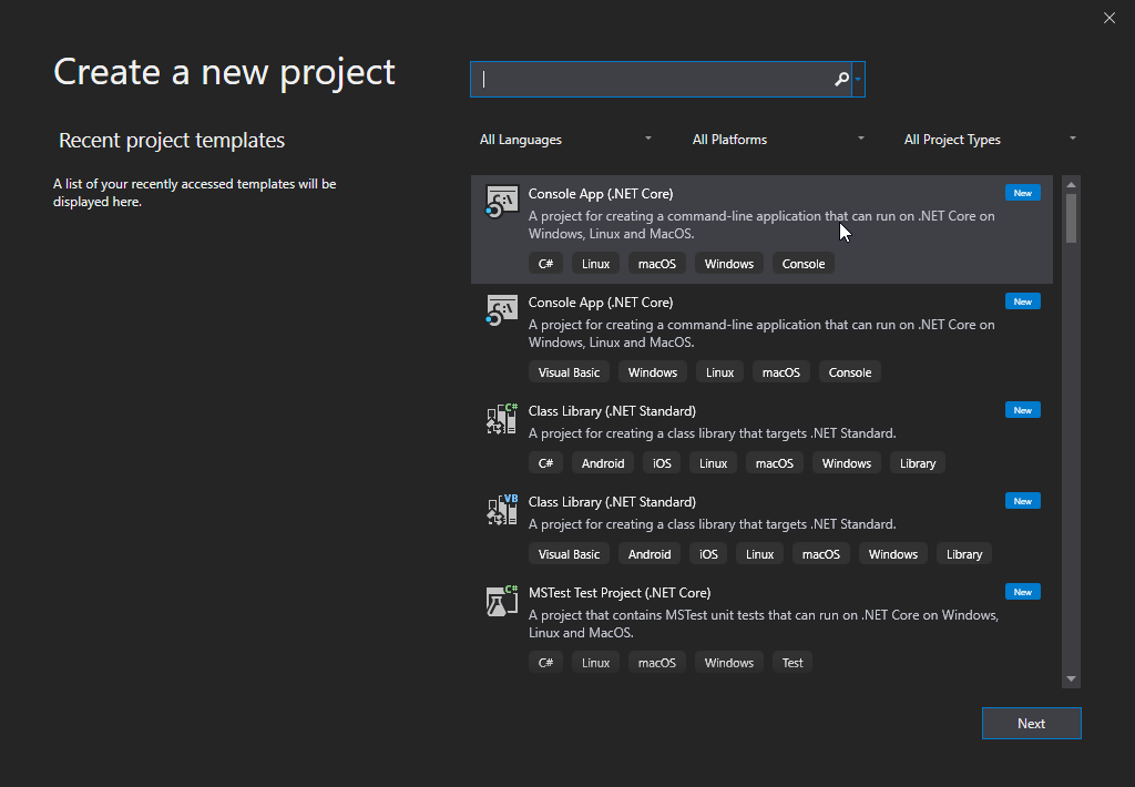 リストから「コンソール アプリ (.NET Core)」を選択し、[次へ] ボタンをクリックします。