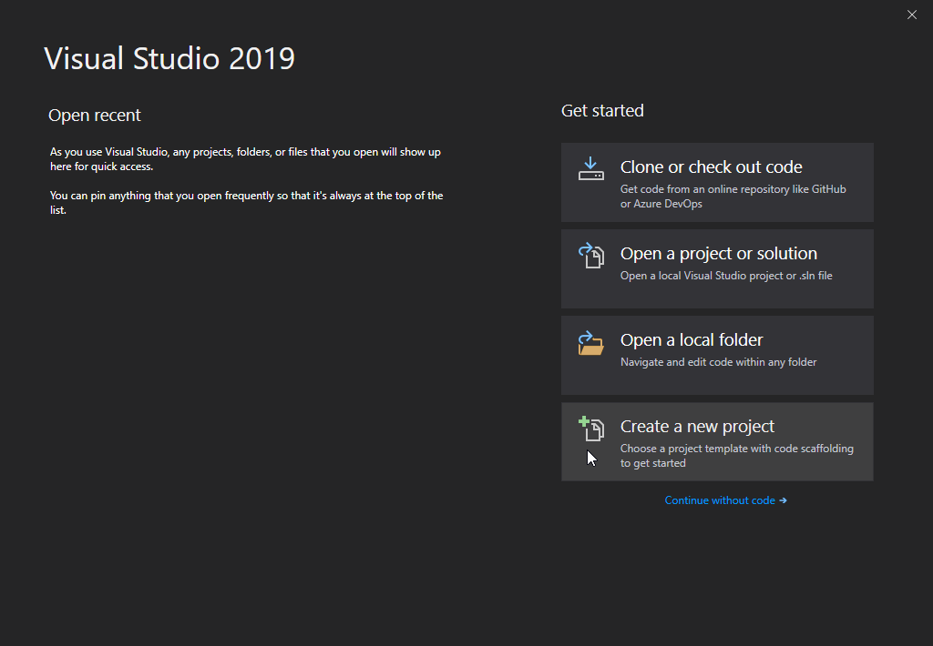 スタート ウィンドウで、[新しいプロジェクトの作成] を選択します。