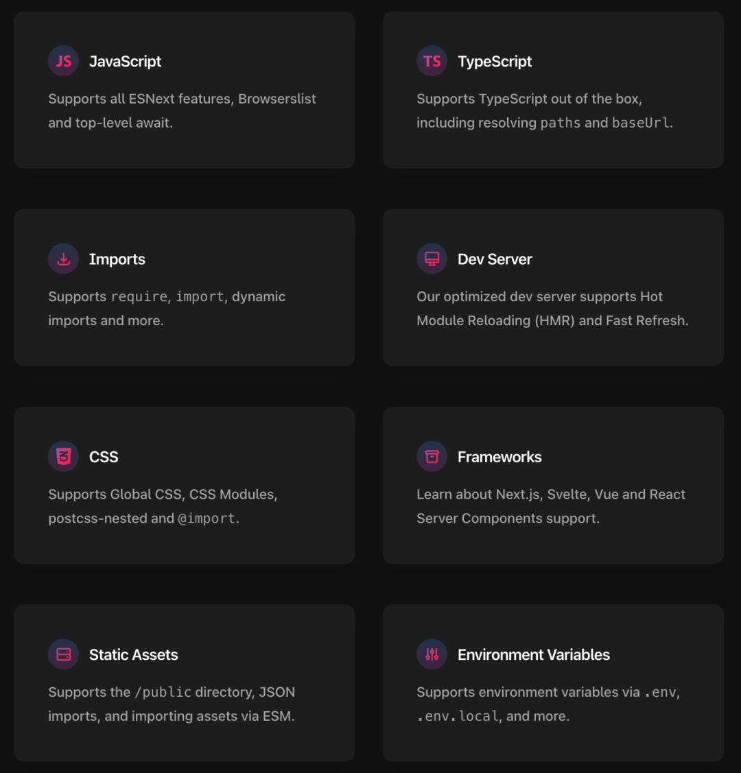 環境変数: .env、.env.local などを通じて環境変数をサポートします。