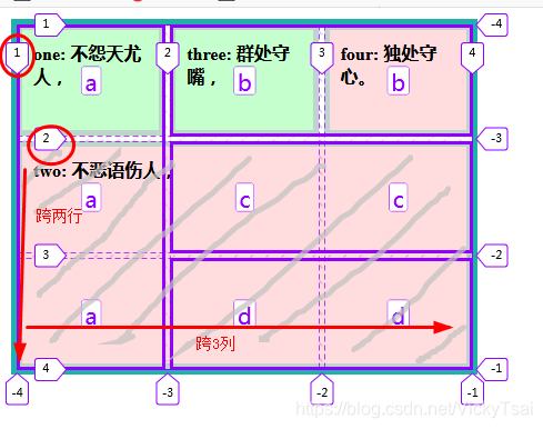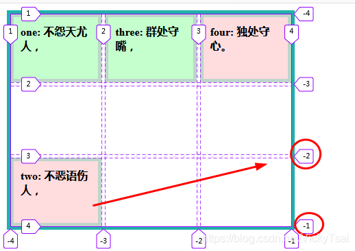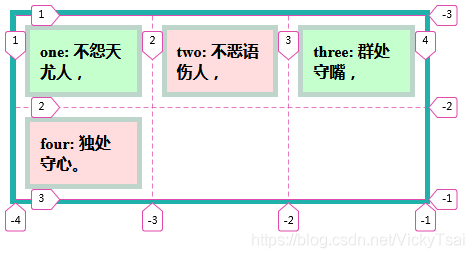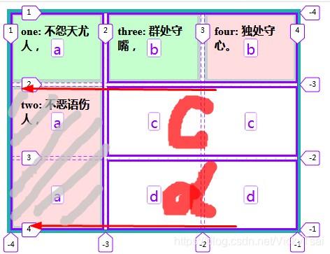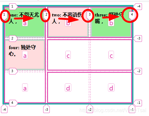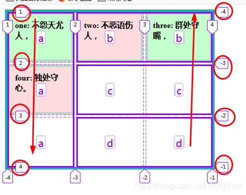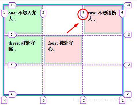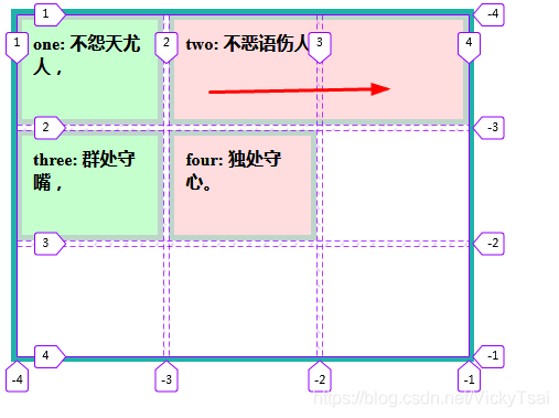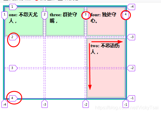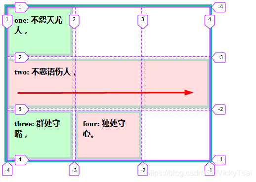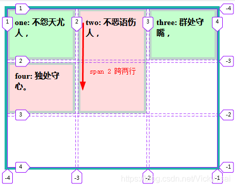 span グリニドアイテライッジのグリッド空间の反応するエッジが反対側のエッジからn行になるように、グリニドアイテムの設定にグリッドスパンガが提供されることをします。<custom-ident>, その名前を持つ十分な行が組織しない实常は、このスパンを计算するために、検索方向に反応するのくかすべての黑黙的グリッドのにあるすべての黑黙的グリッドラインがその名前を持つとみなされます。指定されたグリッド項目の位置、行2~4の際、行3~4の際を指定します