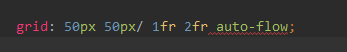 grid: [ auto-flow &&dens? ] <grid-auto-rows>? / <grid-template-columns>grid: auto-flow dense 50px 100px/ 1fr 2fr;