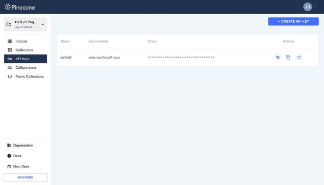 Pinecone APIキーは、こちらから入手できます。