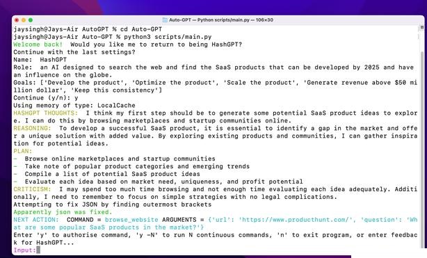 AIが送信するコマンドを承認し、ステップバイステップでタスクを完了させます。 AIの開発状況を確認し、必要に応じて適切な対処を行う。 AIが仕事を終え、目標を達成すると、自動的に電源が切れます。 AutoGPTは、与えられた指示に基づいて、次のような出力をしてくれます。