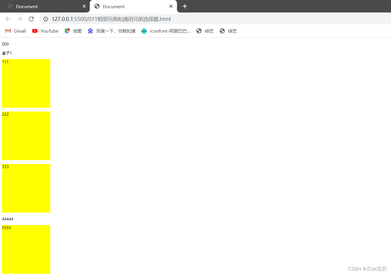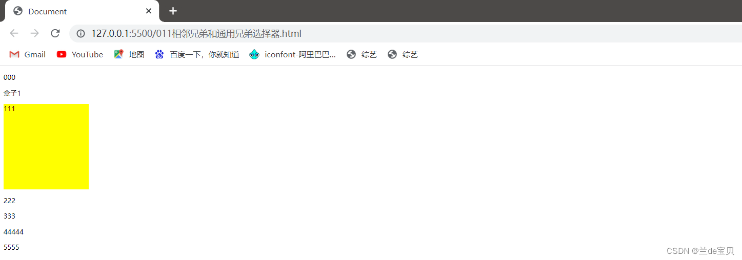 上記のコードを例にとると、「5555」という内容のラベルのスタイルを自分で変更したいという要件があり、残りは変更されません。最初にそれを分析しましょう。このラベルは非常に明白です。隣接する兄弟要素を選択するか、一般的な Brother 要素は p5 タグのみを変更することはできません。まず、.box の後ろにある p タグを確認します。そして、.box の後ろに div タグが 1 つだけある場合、p5 がこの div の兄弟要素のコードは次のとおりです。