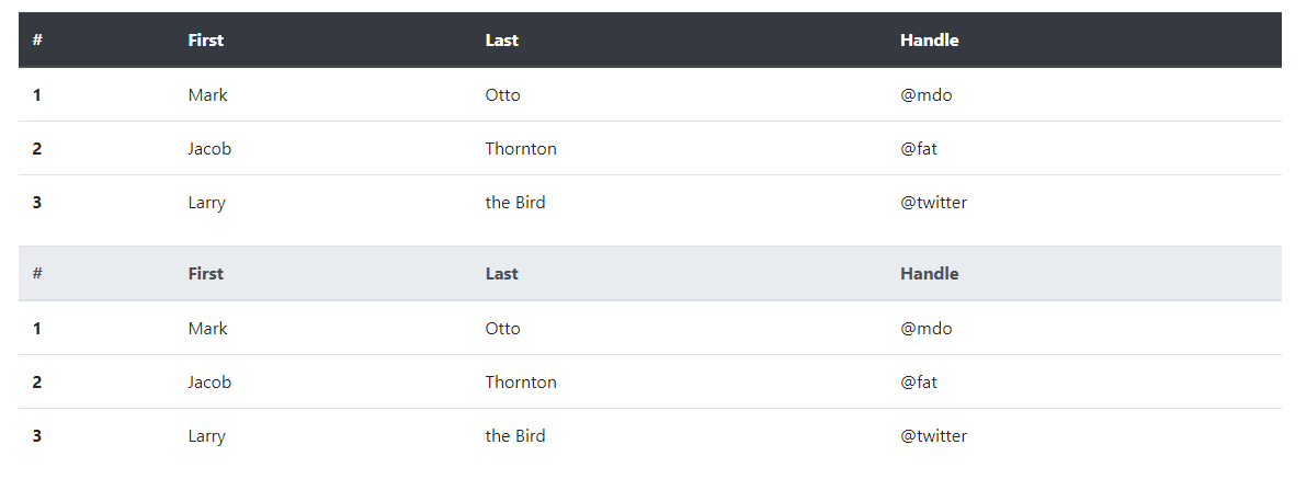 テーブルやダークテーブルと同様に、修飾子クラスを使用する. head-lightか、 を明るい灰色または暗い灰色で表示し. head-darkます。< head>