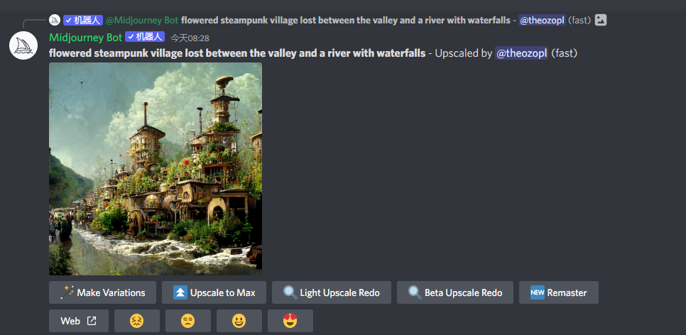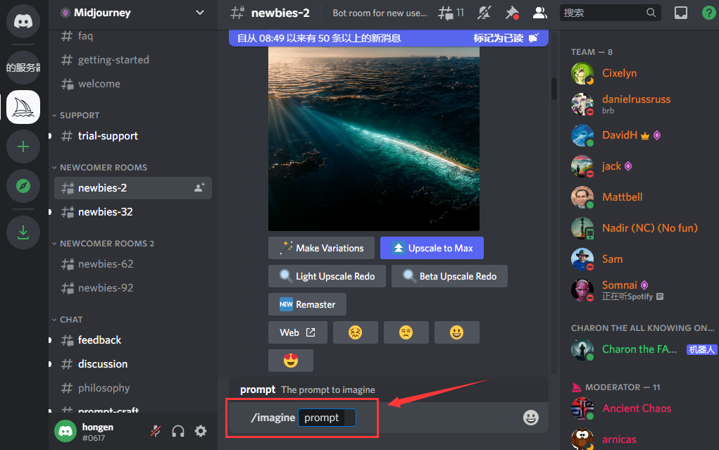 5: /imagine と入力して Enter キーを押し、生成するイメージのテキスト説明を入力し、Midjourney ロボットがニーズを処理するまで待ちます。