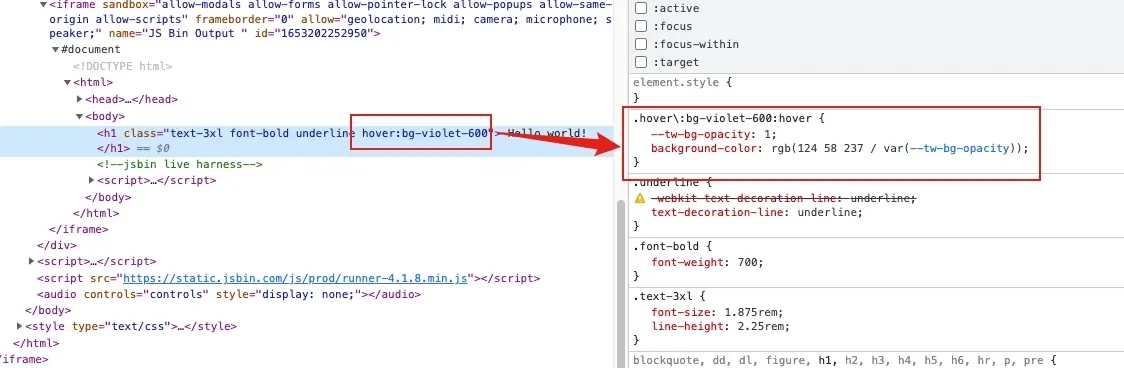 <h1 class="text-3xl font-bold underline hover:bg-violet-600"> Hello world!</h1>